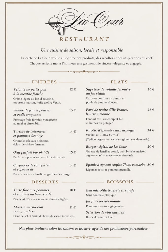 À La Cour, chaque plat est pensé comme une rencontre entre le savoir-faire culinaire et le respect du produit. Notre carte évolue au rythme des saisons et met à l’honneur des ingrédients issus de circuits courts, sélectionnés auprès de producteurs passionnés. Dans une approche bistronomique sincère et contemporaine, nous vous invitons à découvrir une cuisine raffinée, responsable et conviviale, à partager au cœur d’un lieu unique.